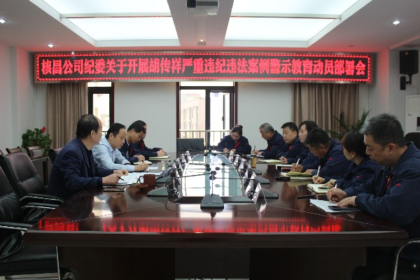4月30日上午,核昌公司紀委在公司小會議室組織公司班子成員、各黨支部書記召開關于胡傳祥嚴重違紀違法案例警示教育動員部署會。會議由公司紀委書記梁英平主持。首先,梁書記對集團公...