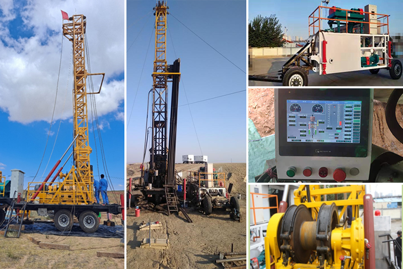 HXY-1600型(機(jī)械動(dòng)力頭長行程給進(jìn))拖車鉆機(jī)和HXY-2000智能鉆探機(jī)組,是一款用于砂巖型鈾礦地質(zhì)勘探和開采、機(jī)動(dòng)性好、卷揚(yáng)機(jī)提升力更強(qiáng)、鉆探深度更深的新產(chǎn)品。該設(shè)備與國內(nèi)外同類鉆機(jī)相比,在進(jìn)尺速度、上下鉆速度、孔底壓力控制、鉆進(jìn)參數(shù)顯示和控制方面具有顯著的特點(diǎn),杜絕了原鉆機(jī)鉆進(jìn)能力不足、鉆塔承載能力小、鉆塔高度低、輔助工作時(shí)間長、卷揚(yáng)機(jī)排繩困難、卷揚(yáng)機(jī)操縱費(fèi)力、鉆塔最大負(fù)荷無法限定等缺點(diǎn),得到了中核集團(tuán)208大隊(duì)、243大隊(duì)、216大隊(duì)、湖南中核勘探有限責(zé)任公司、內(nèi)蒙煤田地質(zhì)局等單位的一致認(rèn)可。