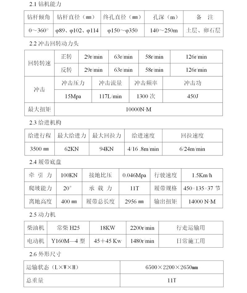 全液壓控制,機(jī)身結(jié)構(gòu)堅(jiān)固,設(shè)計(jì)理念先進(jìn),儀表監(jiān)控,操作靈活方便,充分保證設(shè)備的實(shí)用性能。設(shè)備采用電動(dòng)機(jī)作為主動(dòng)力源,并且備有一個(gè)18Kw的小柴油機(jī)作為無(wú)電源時(shí)行走及搬運(yùn)上下車(chē)時(shí)使用。電機(jī)總功率為90KW,其中用于用于動(dòng)力頭回轉(zhuǎn)的有65Kw,所以鉆機(jī)回轉(zhuǎn)扭矩比同類(lèi)型的要大將近一倍,沖擊力和提升力都非常強(qiáng)大,工作效率高,可一機(jī)多用,以邊坡錨固工程施工為主,也可以廣泛用于建筑深基坑、地鐵、隧道、鐵路、公路、地質(zhì)災(zāi)害治理的錨固施工和小型樁的施工。